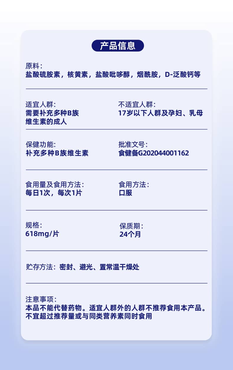 - 成分齐:B1:B2:B6=2:2:1的黄金配比,吸收好协同增效