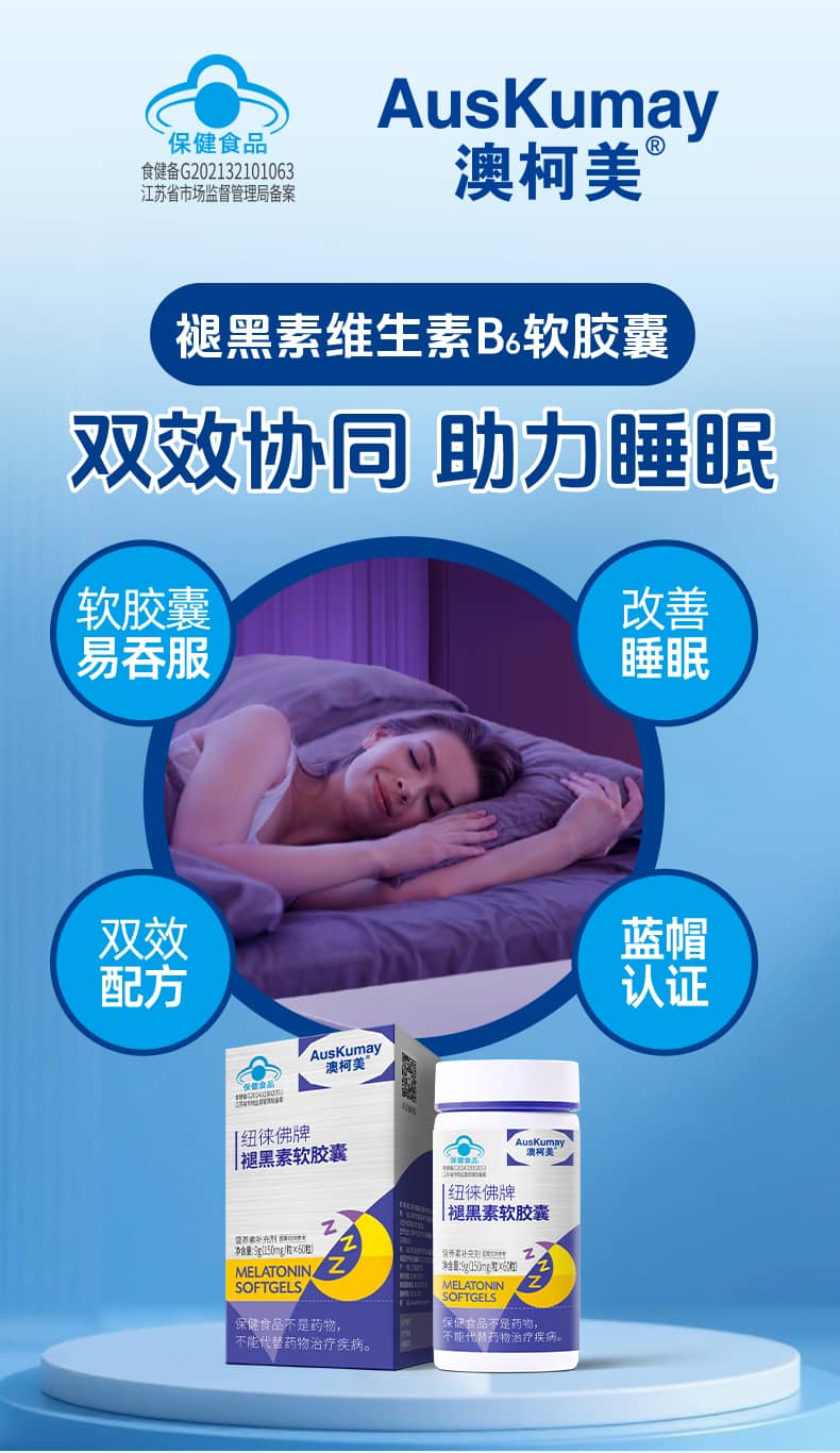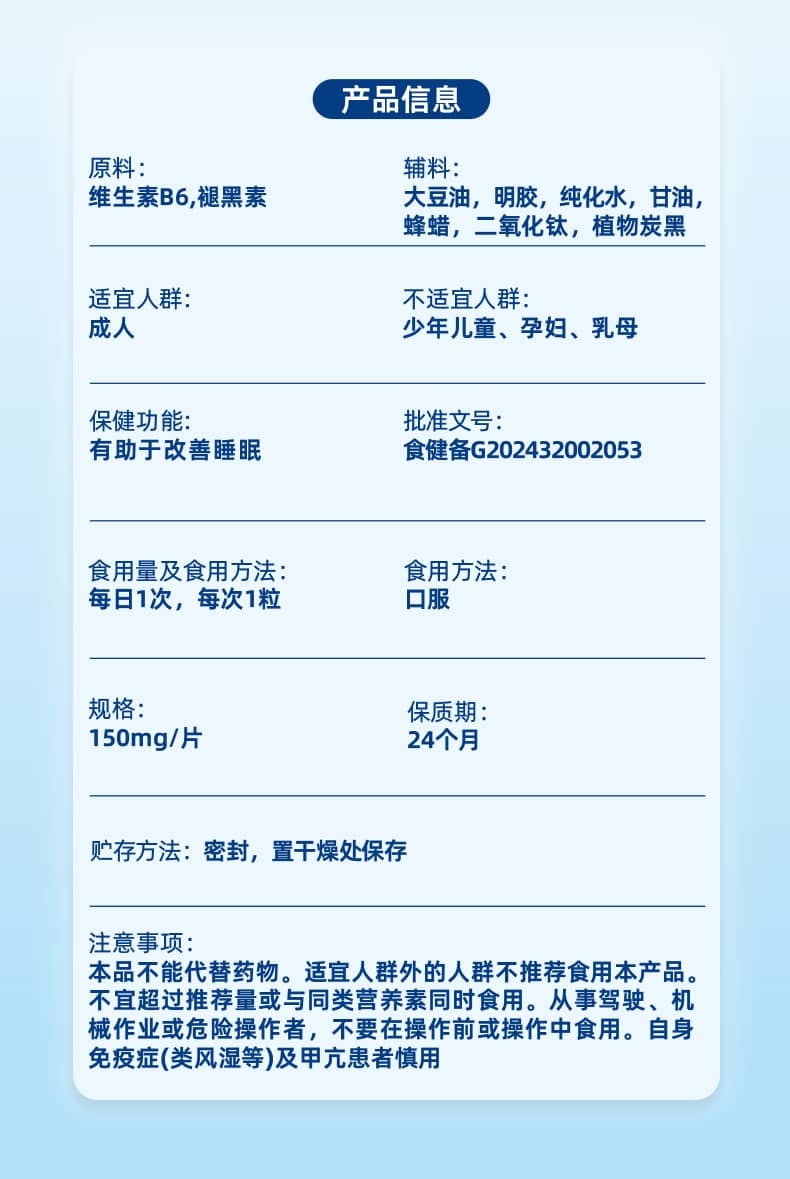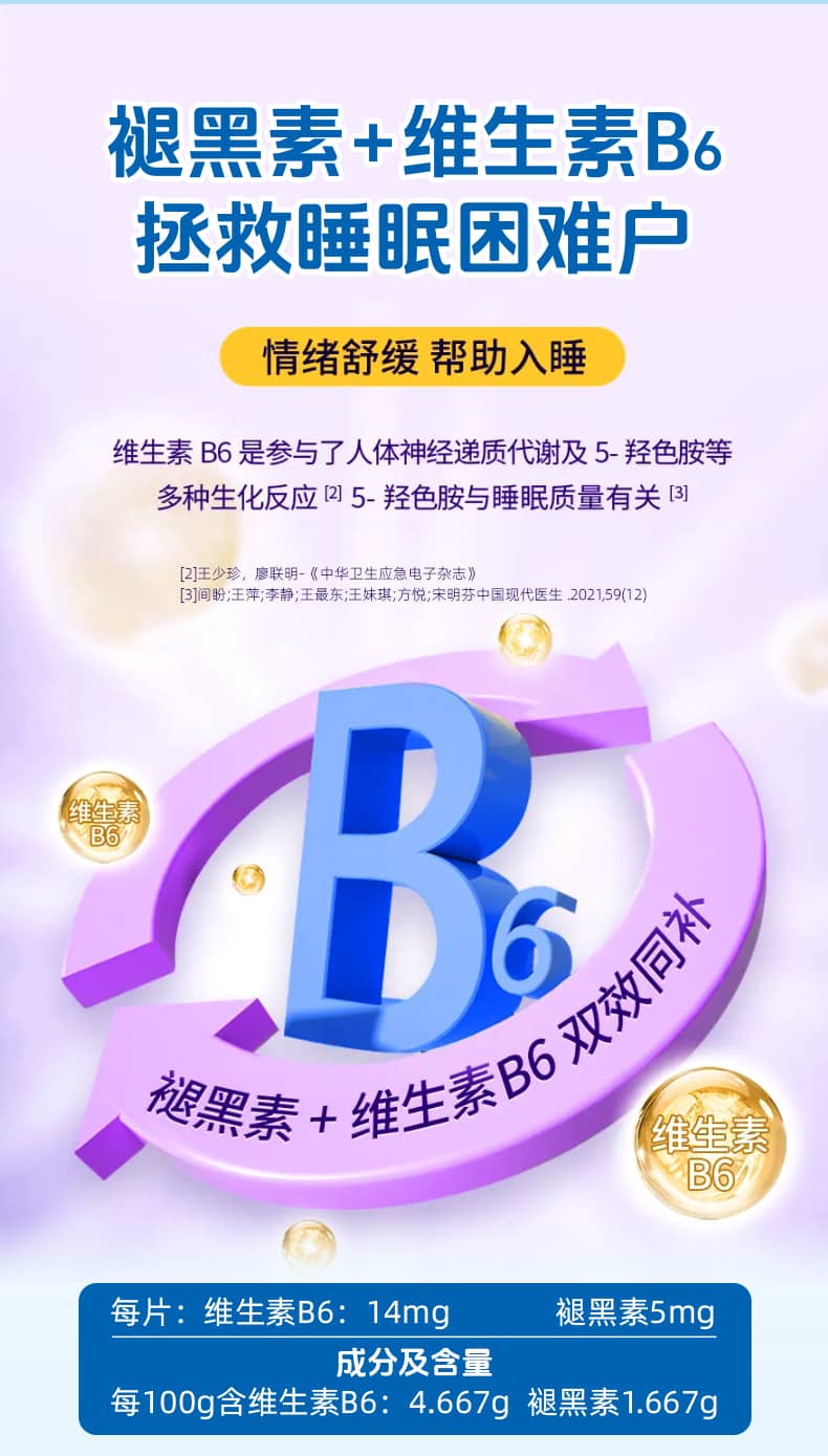 - 提升睡眠质量 维生素B6参与多种生理代谢反应,保障身体机能正常运转,间接助力睡眠 。搭配褪黑素,不仅能加快入睡速度,还可减少睡眠中觉醒次数,延长深睡阶段,让人获得更充分休息,提升睡眠整体质量,改善次日精神状态和注意力。