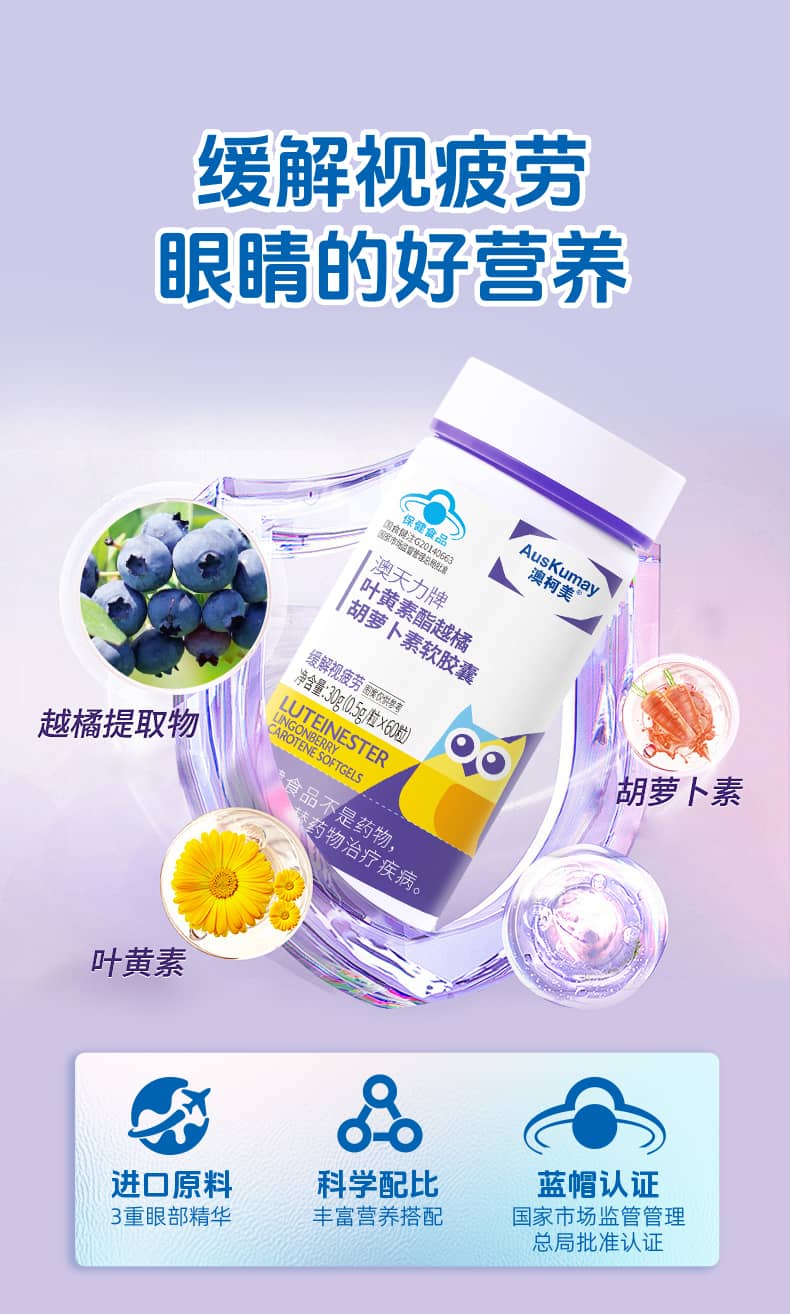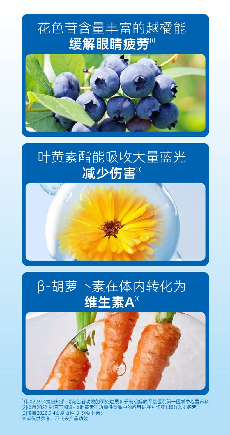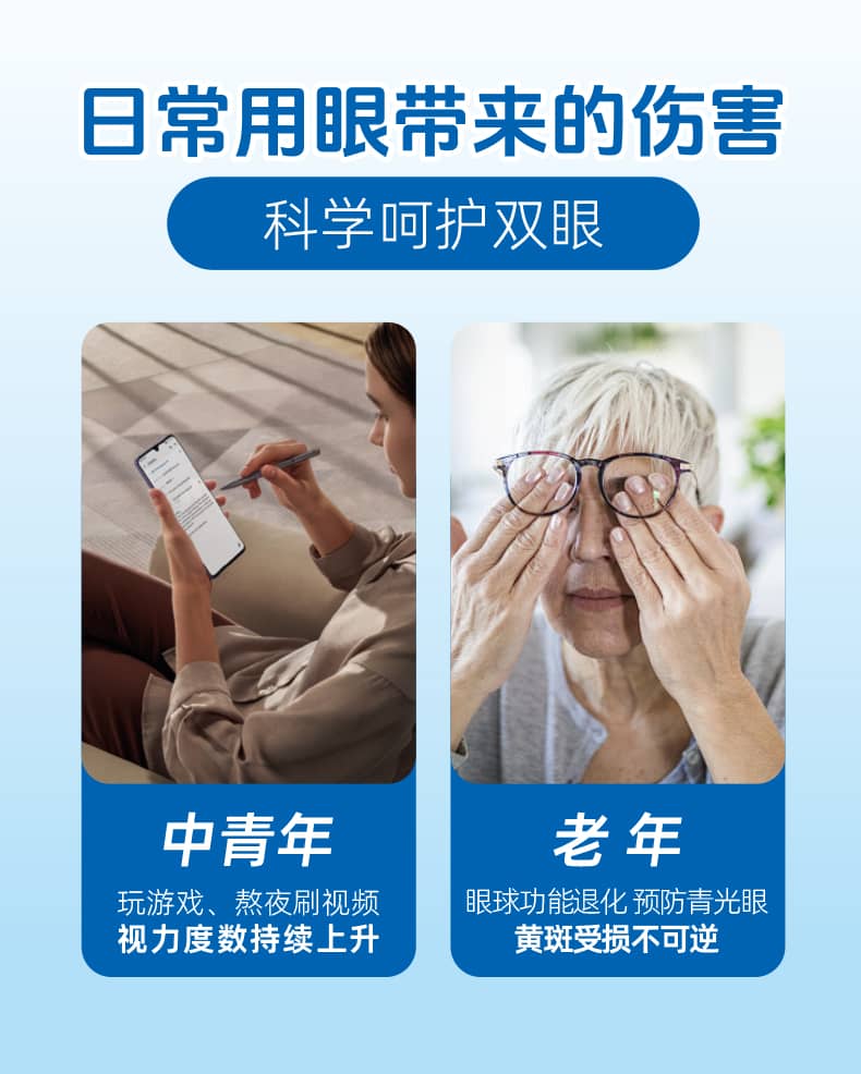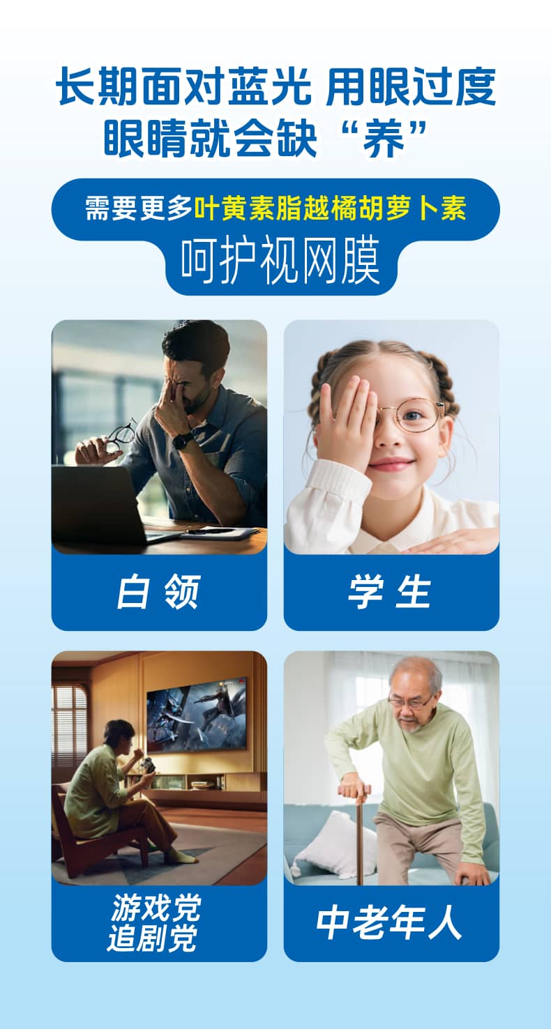 叶黄素过滤蓝光,花青素抗氧守护,看得更清晰更持久。