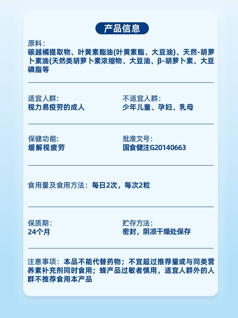 - 保护视网膜:叶黄素过滤蓝光,缓解眼疲劳、干涩、畏光,延缓眼睛衰老